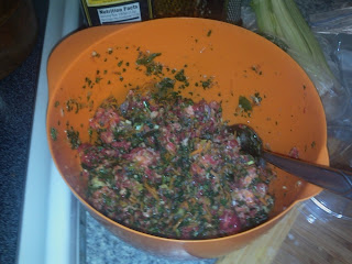 Run the above through a food processor, using short pulses until the mixture is finely chopped but not paste (I like to put the veggies in first, run them for a bit, then add the meat).